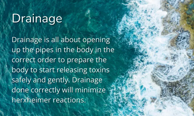 Drainage is all about opening up the pipes in the body in the correct order to prepare the body to start releasing toxins safely and gently. Drainage done correctly will minimize herxheimer reactions.
