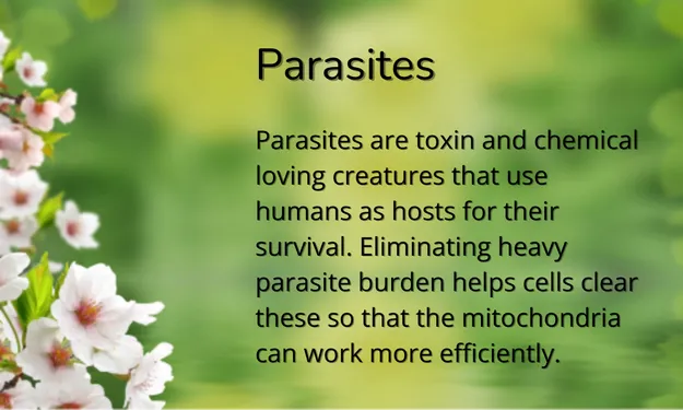 Parasites are toxin and chemical loving creatures that use humans as hosts for their survival. Eliminating heavy parasite burden helps cells clear these so that the mitochondria can work more efficiently.